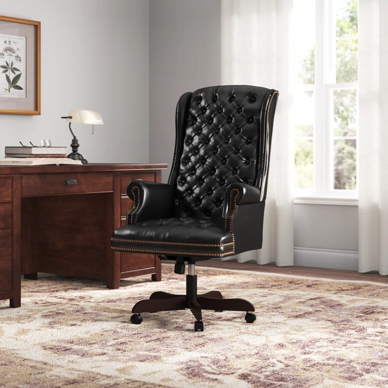 Show them who’s boss with this distinctive executive chair. We love that it swivels and offers an adjustable tilt function, so you can find just the right position as you’re getting down to business. This chair is made of wood and upholstered in fire-resistant faux leather. It features a Chesterfield design, with a high back and rolled arms. Tufted detailing and nailhead trim elevates the look. Plus, five double-wheeled casters on this chair’s spider base allow you to move between projects with ease.